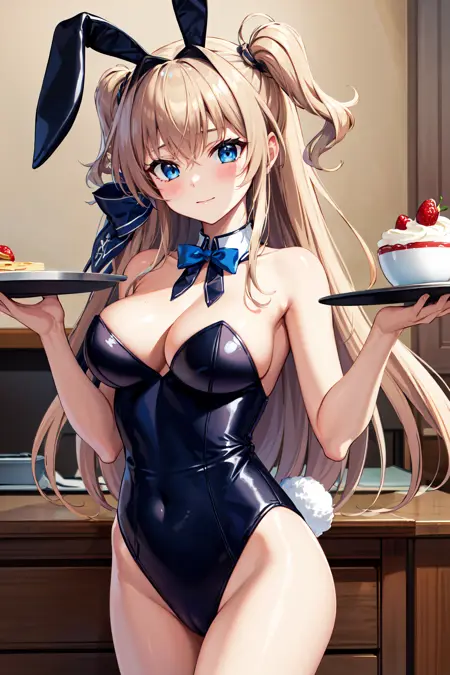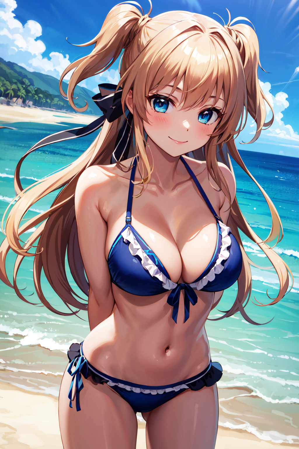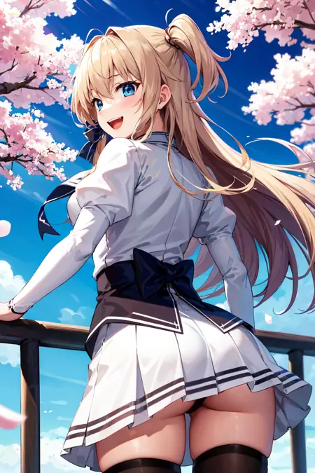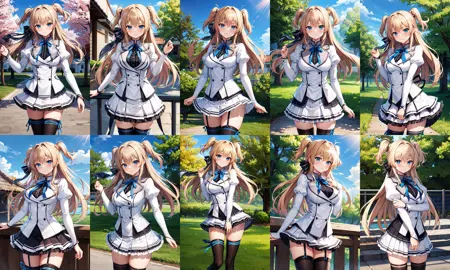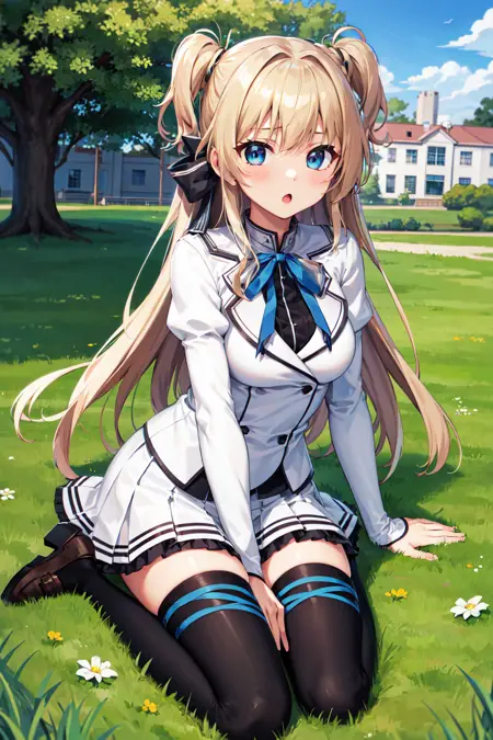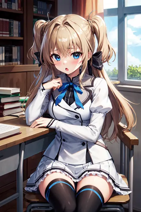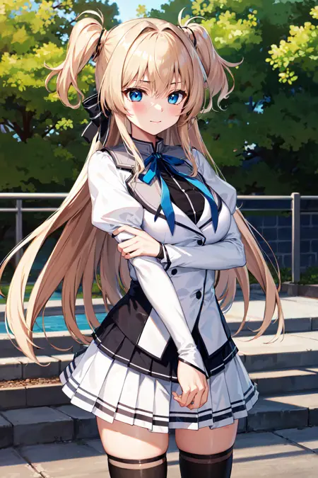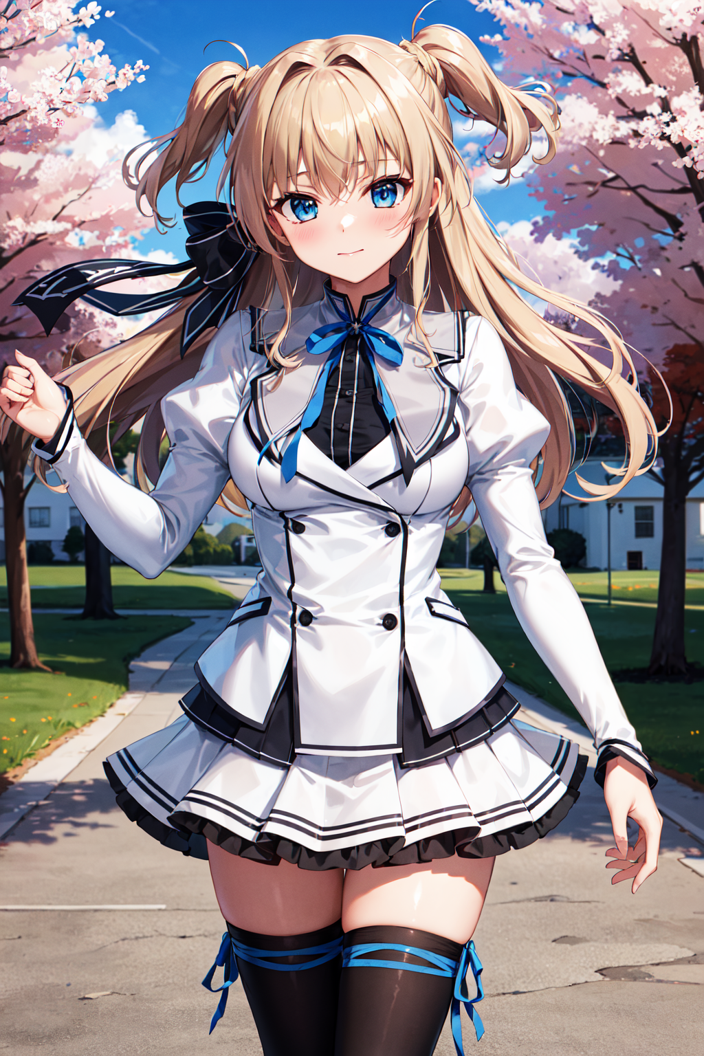 1girl, solo, long hair, blonde hair, two side up, hair ribbon, blue eyes, neck ribbon, school uniform, white jacket, juliet sleeves, long sleeves, white skirt, thigh ribbon, black thighhighs
