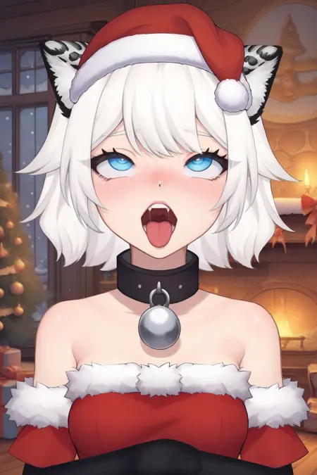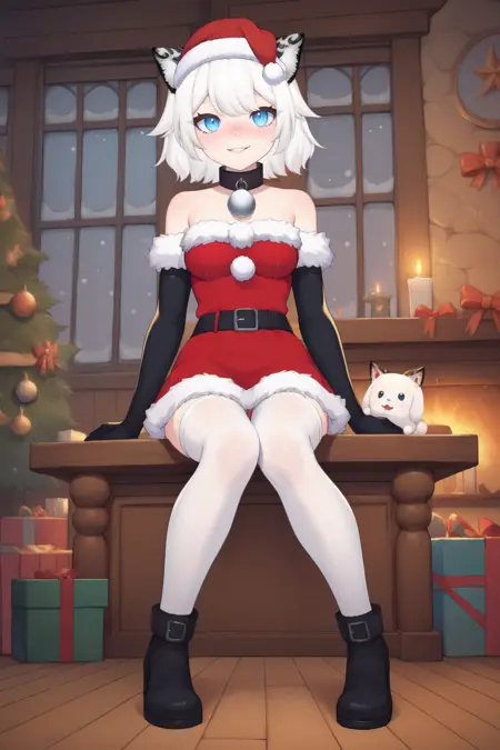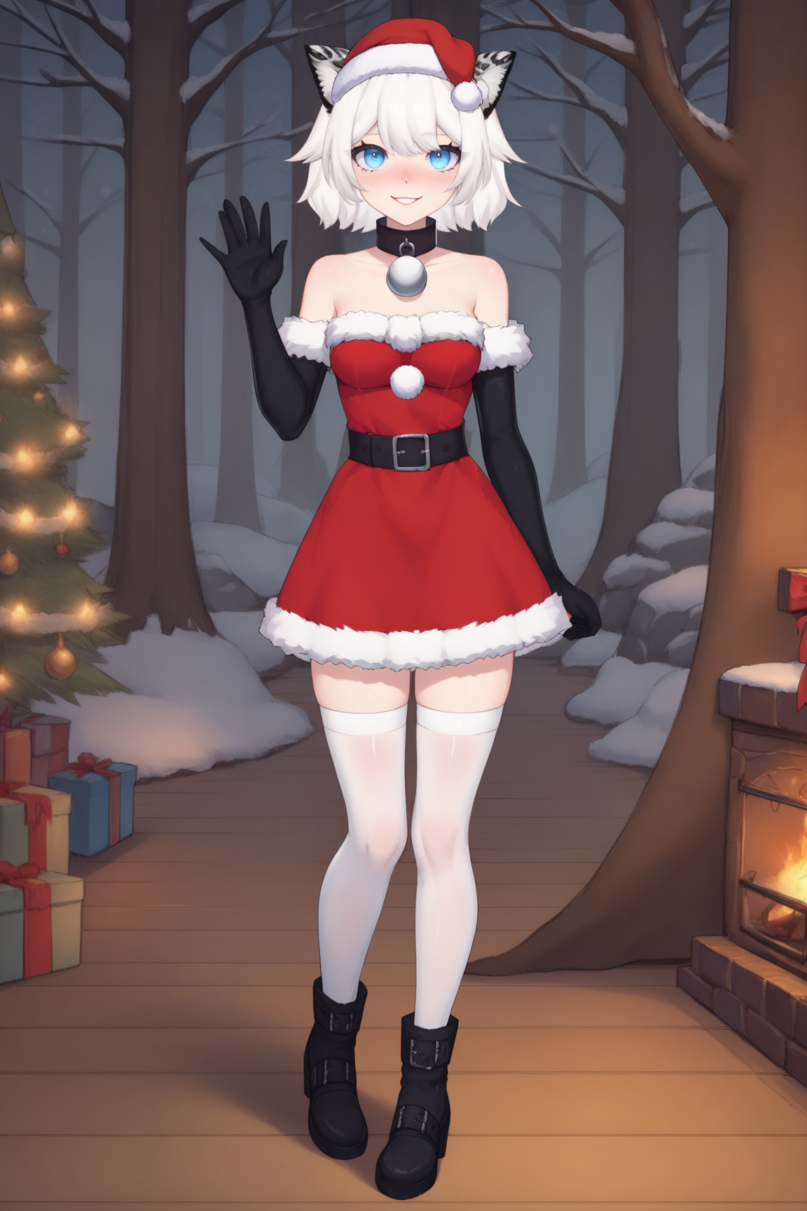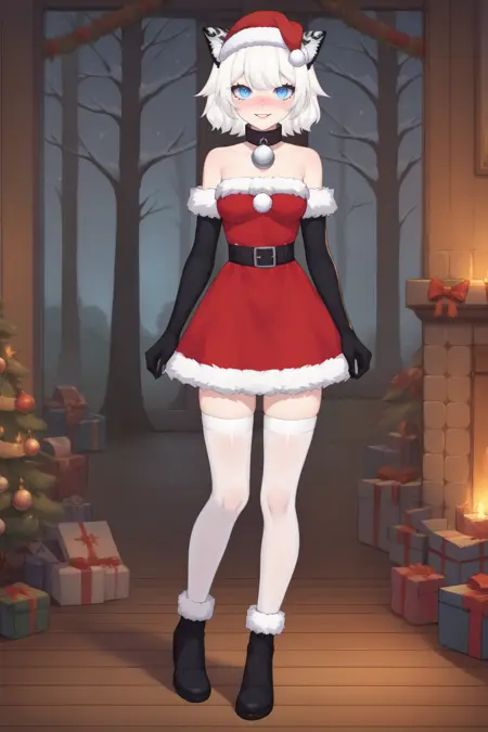 ➜ OreoVTPXL, blue eyes, white hair, short hair, bangs, animal ears, collar, santa hat, medium breasts, bare shoulders, red dress, santa dress, fur trim, black elbow gloves, red skirt, white thighhigs, black shoes