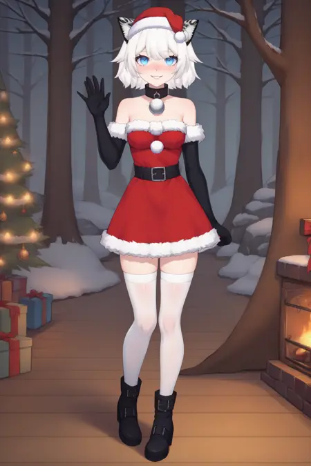 ➜ OreoVTPXL、青い目、白い髪、短い髪、前髪、動物の耳、首輪、サンタ帽、中程度の胸、肩を露出、赤いドレス、サンタドレス、ファー縁取り、黒い肘手袋、赤いスカート、白い太ももハイ、黒い靴