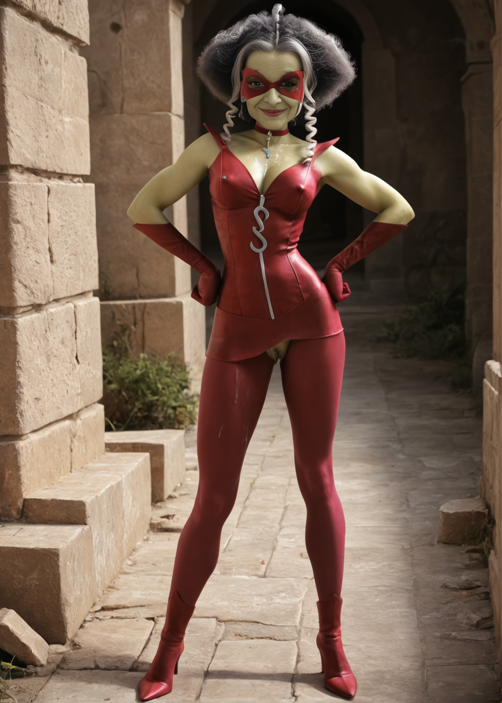 Prompt: trixstormy, solo, 1girl, mask, colored skin, green skin, claws, gloves, elbow gloves, purple hair, afro, pantyhose, choker, blue eyes, boots, high heels, short dress
