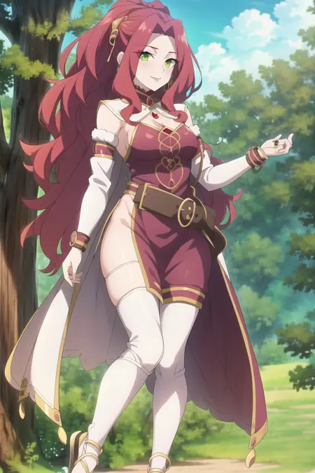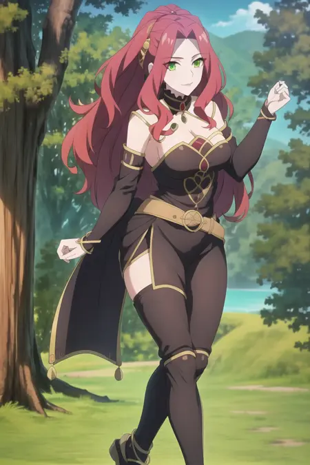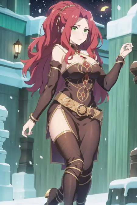 For better appearance add "red jewelry, green eyes, red hair, steel armor, belt, cleavage, bare shoulders, purple skirt"