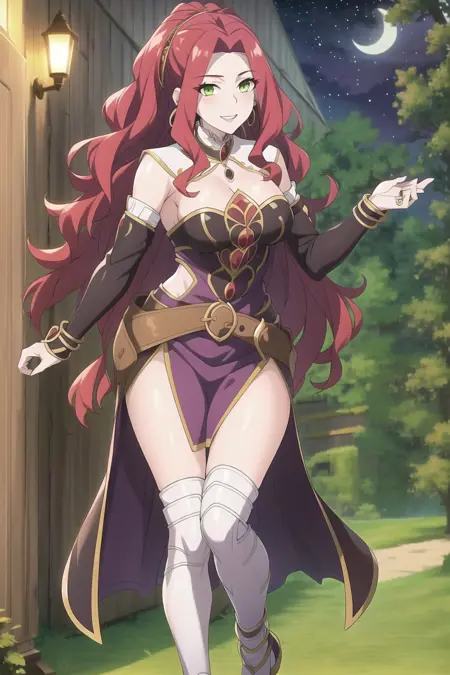 더 좋은 외모를 위해서는 "빨간 보석, 녹색 눈, 빨간 머리, 강철 갑옷, 허리 belt, 절개, 고개 들린 어깨, 보라색 스커트" 추가해 주세요.