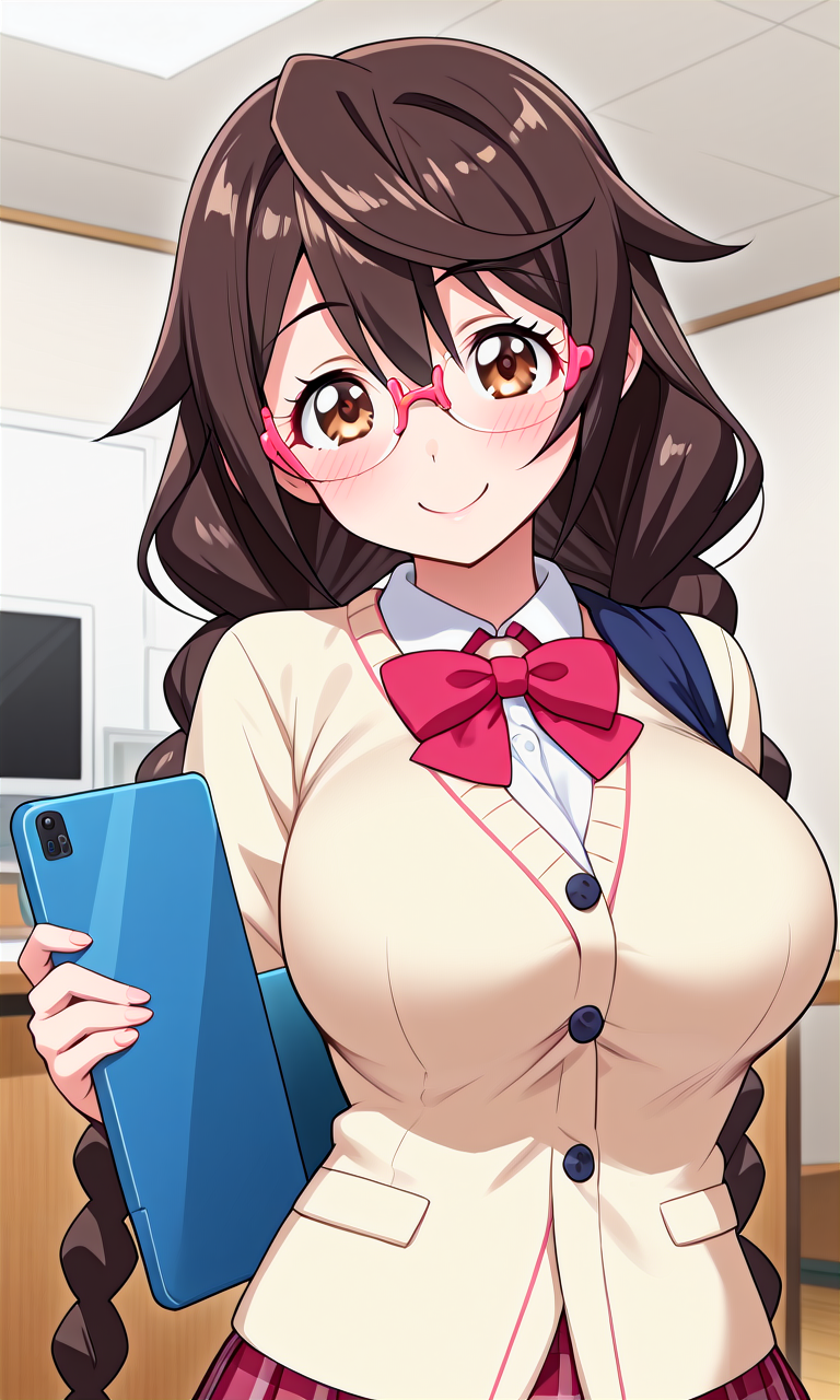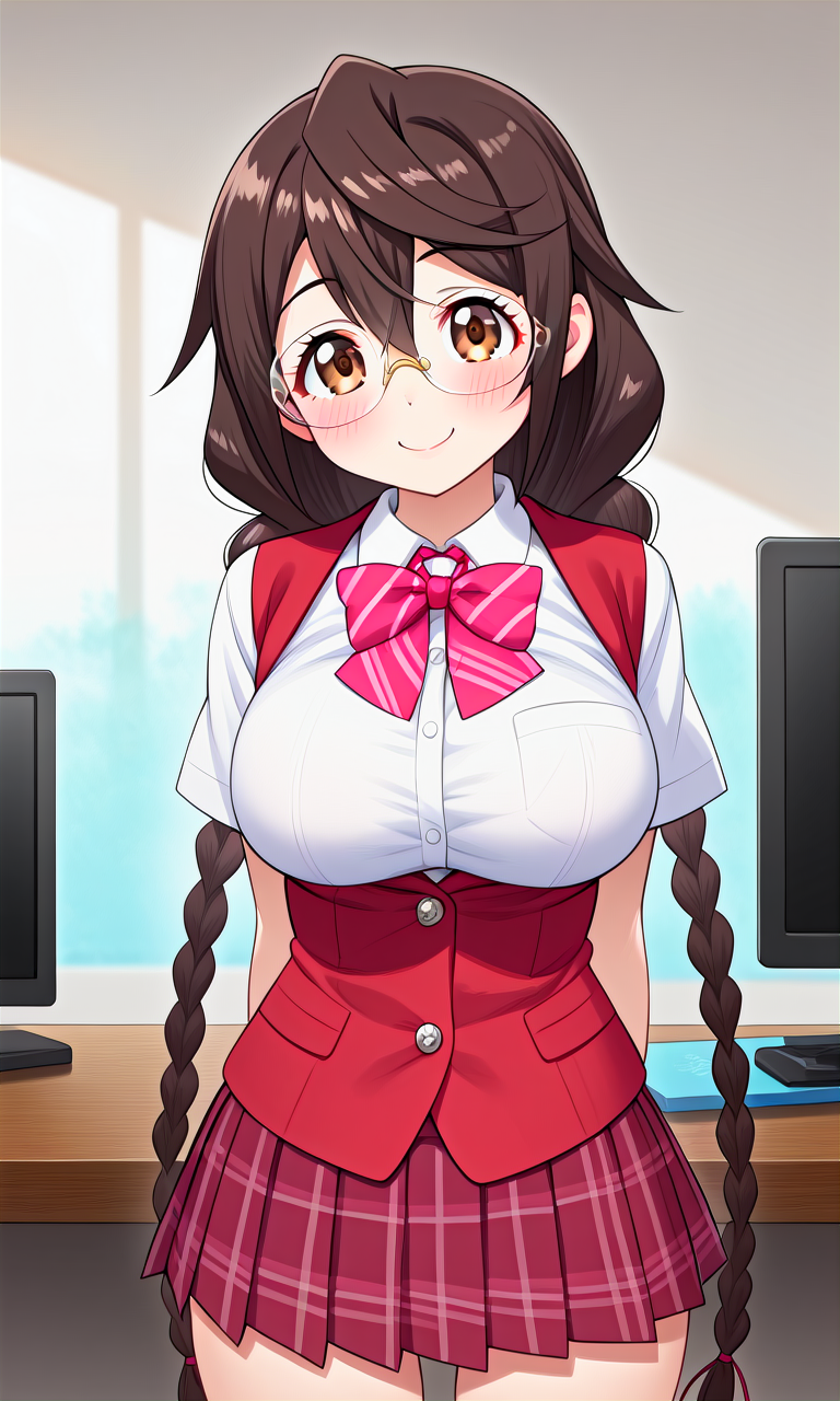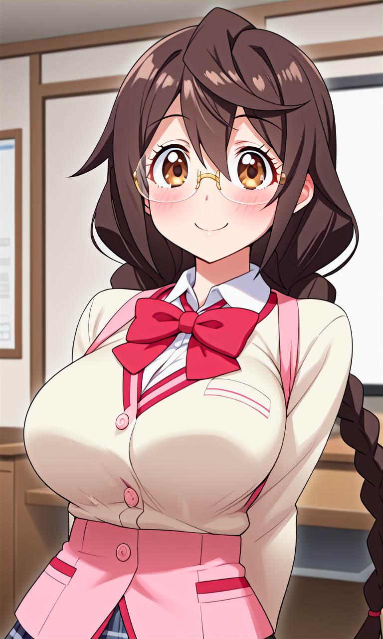 sakaki ayaka,glasses,darkbrown hair,long hair,twin braids,huge breasts,wide hips,brown eyes