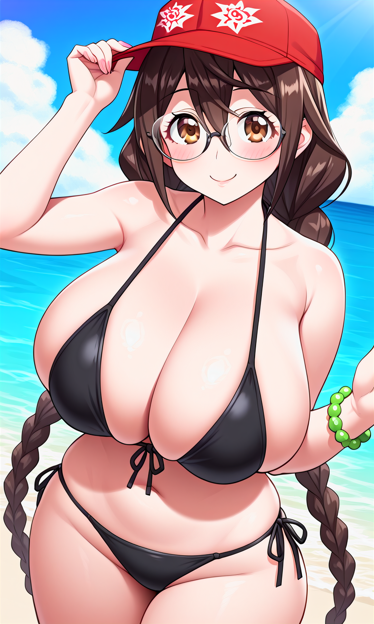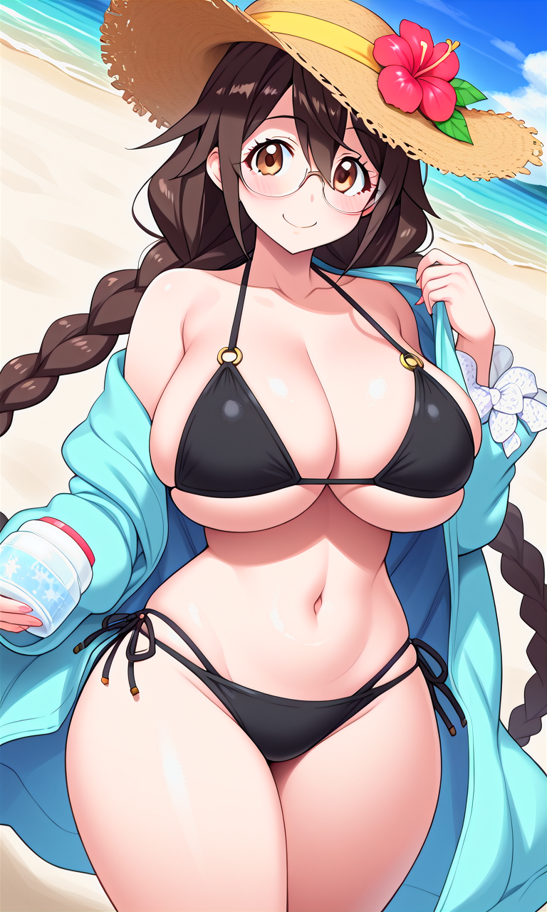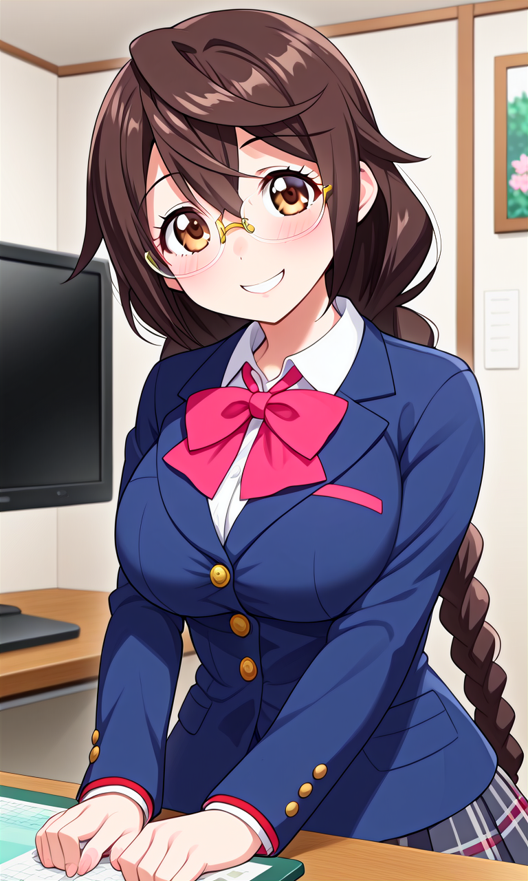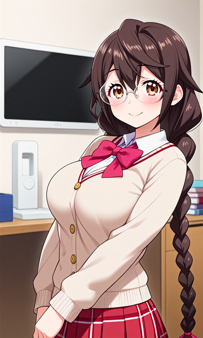 sakaki ayaka,glasses,darkbrown hair,long hair,twin braids,huge breasts,wide hips,brown eyes
