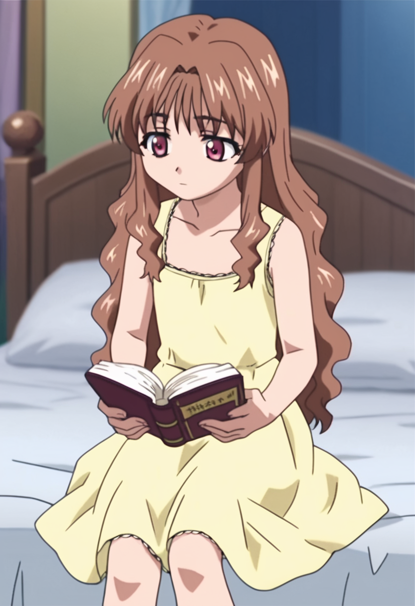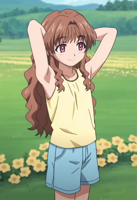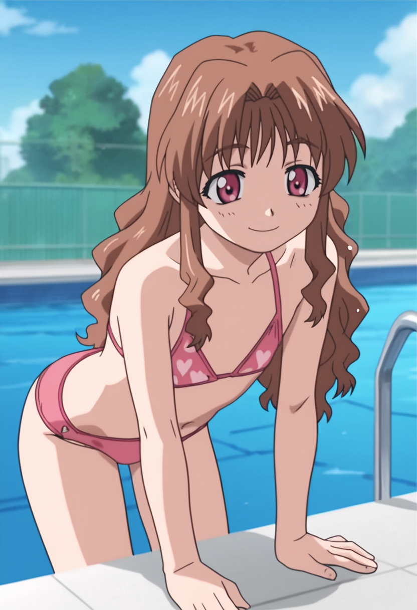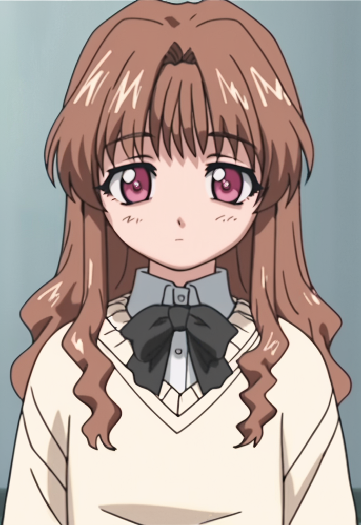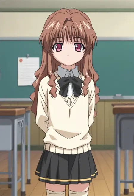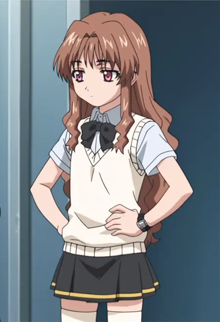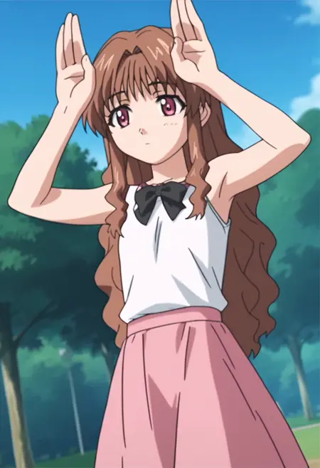基础提示词:morino_ichigo, 1girl, solo, onegai teacher, long hair, brown hair, wavy hair, pink eyes