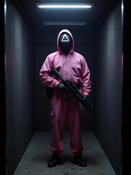 🛡️ 분홍색 점프슈트: 가면과 검은 벨트를 포함한 경비원들의 위협적인 복장을 재현합니다.