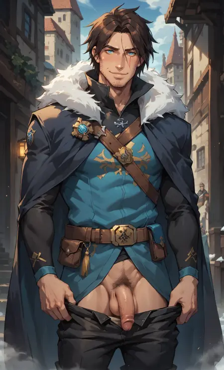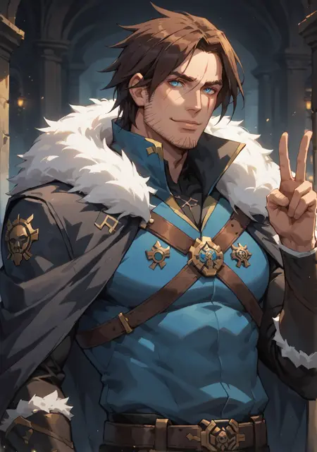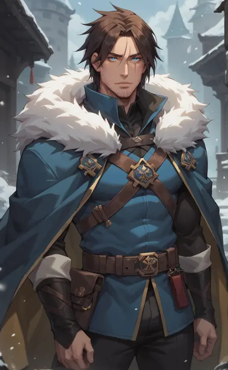 트리거 단어(선택 사항): 흉터, 얼굴 흉터, 갈색 머리카락, 파란 눈, 안면 털, 수염, 투닉, 털 장식, 망토, 높은 칼라,
