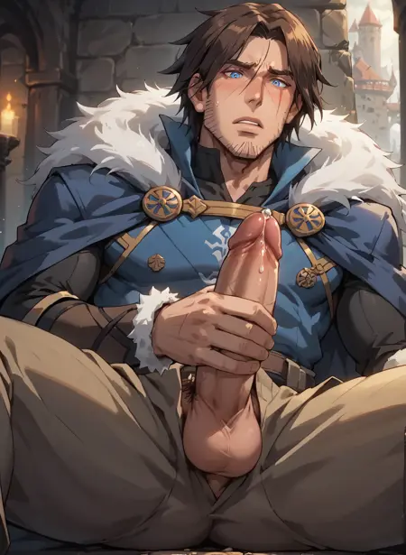 Trigger words (optional): scar, scar on face, brown hair, blue eyes, facial hair, stubble, tunic, fur trim, cloak, high collar,