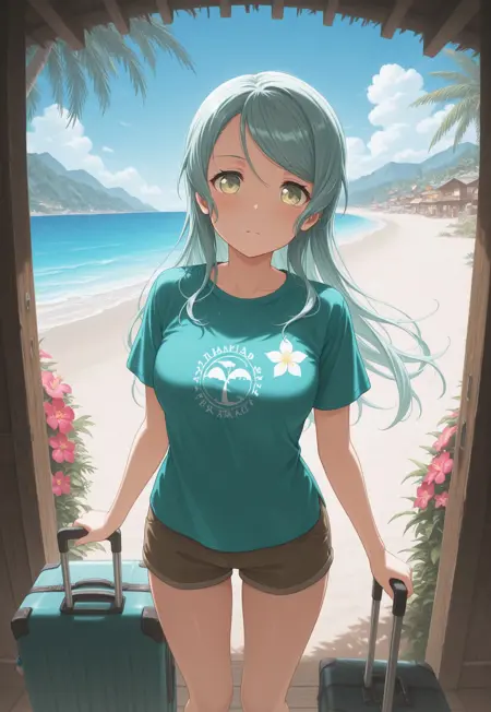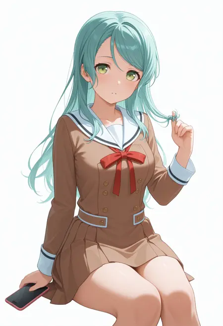 sayohikawa, long hair, aqua hair, green eyes, medium breasts, swept bangs