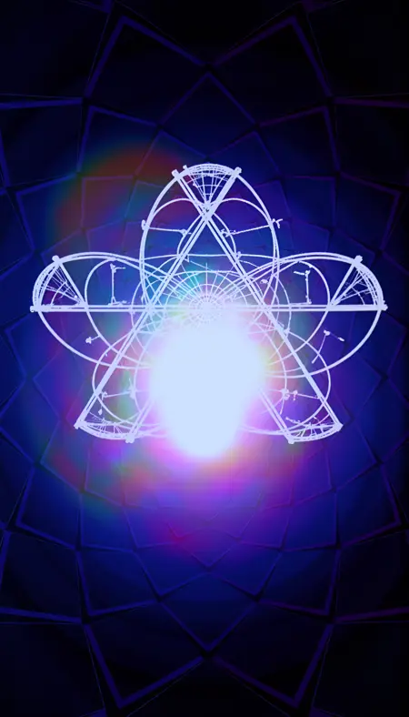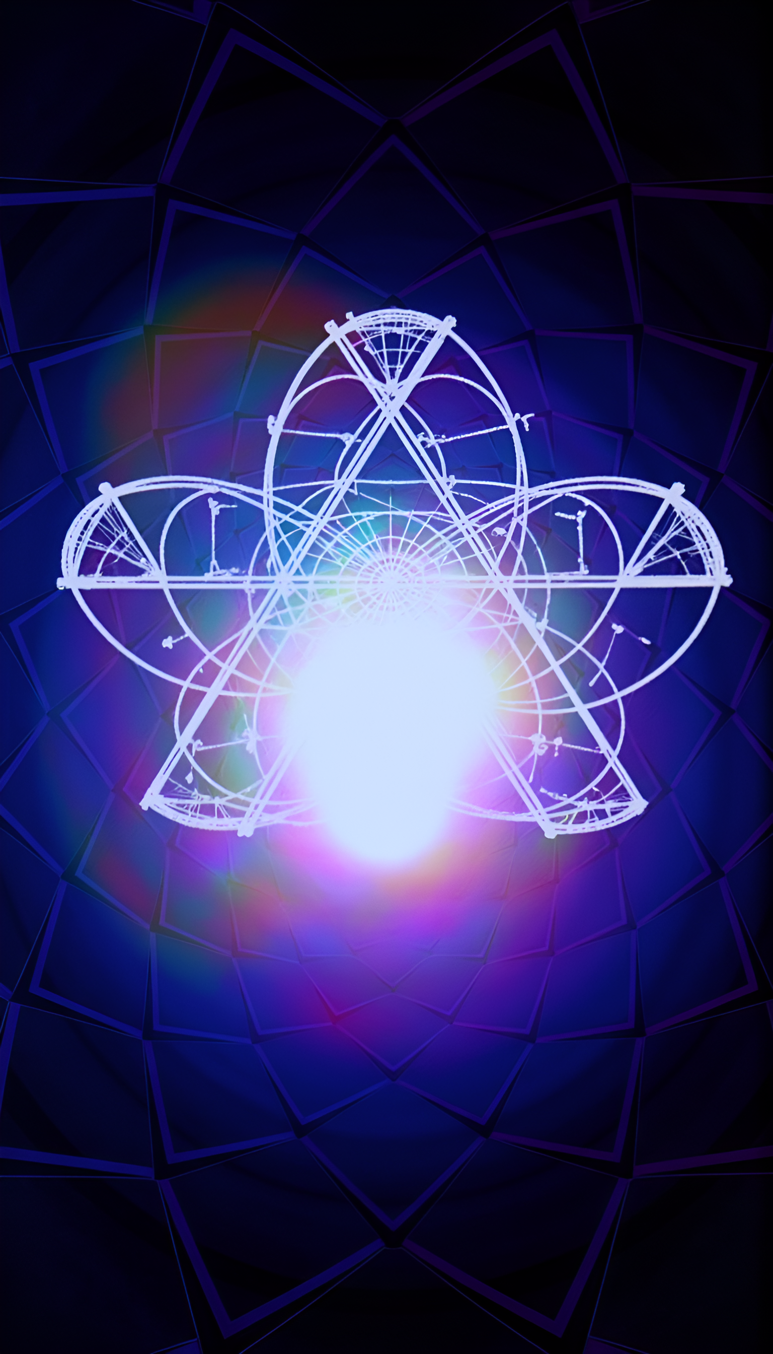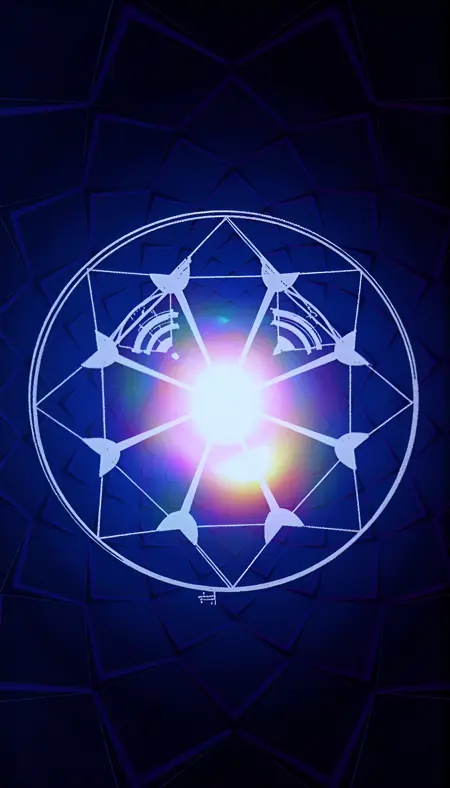 割草机风格。这是一幅数字艺术作品,呈现带有神秘、异界主题的风格化几何设计。背景为深邃暗蓝,带有微妙的漩涡图案,类似星云或分形设计。中央是一个发光、辐射的光源,释放出明亮的白色光芒,并透出粉红与黄色调,形成耀眼效果。该光源周围环绕着由交叉线条与形状构成的复杂对称几何图案。