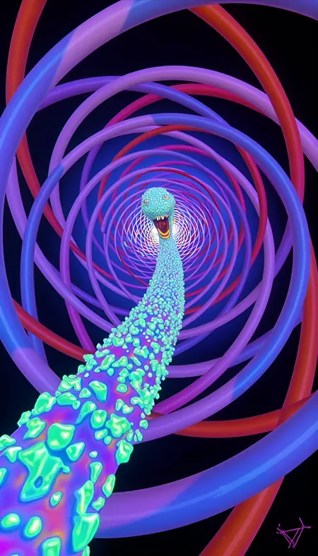 割草机风格。这是一幅数字绘画,描绘了一个古老神秘符号——风格化发光圆环,称为魔法圈或符文。该符文采用鲜艳霓虹色彩,以蓝、紫、粉色调呈现,具有神秘异界感。圆环内填满复杂漩涡图案,类似曼陀罗,营造出迷人催眠的效果。