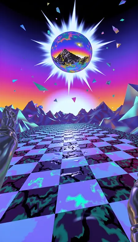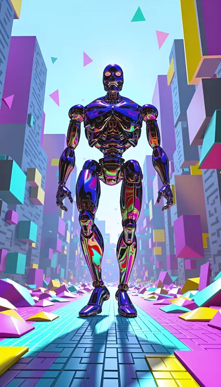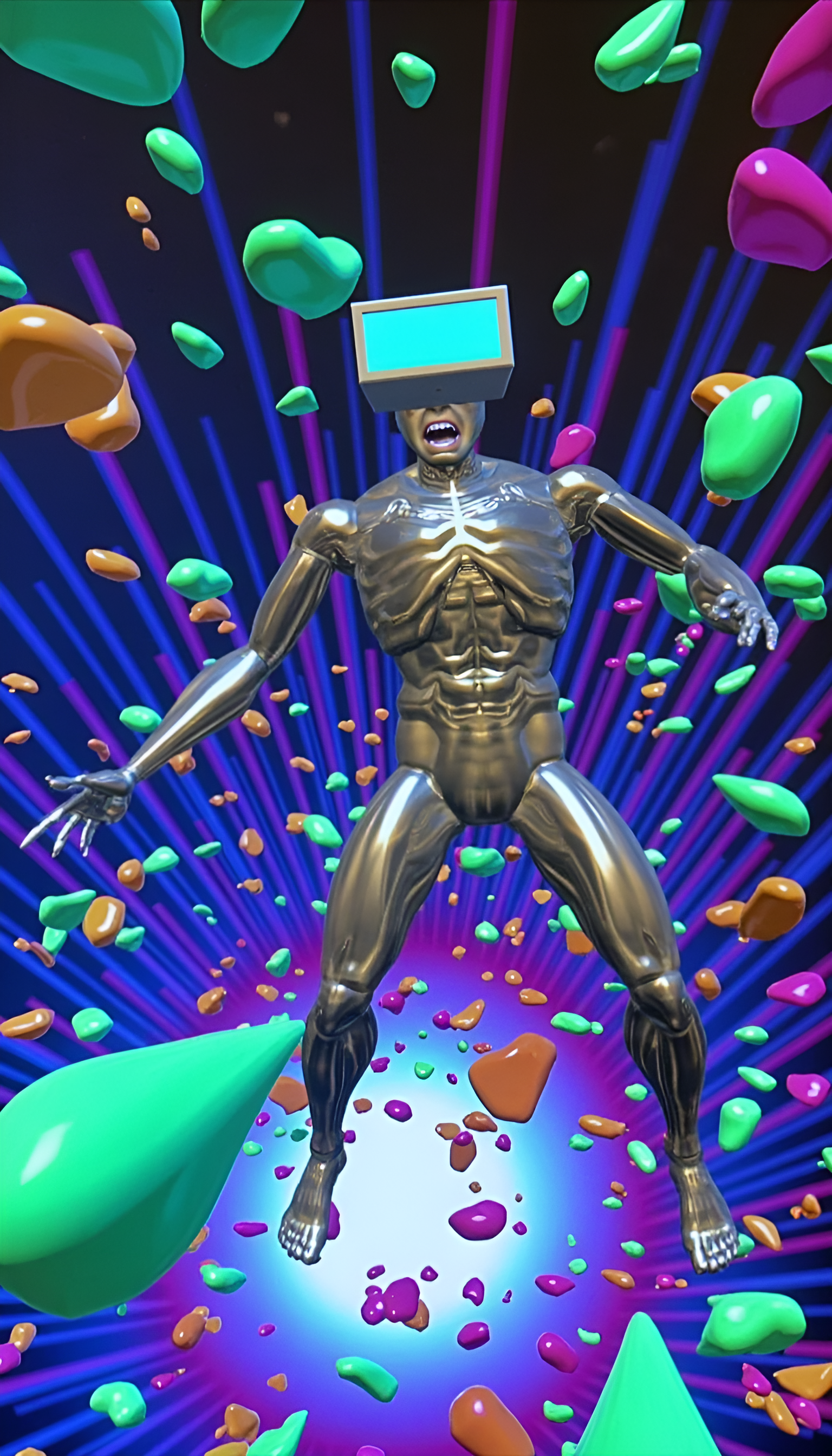 割草机风格。这是一幅鲜艳迷幻的数字艺术作品,描绘风格化抽象场景。中心人物为一个流线型、金属镜面般光泽的类人形体,呈现闪亮反光效果。人物处于动态中,仿佛奔跑或跳跃,右腿向后伸展。人物身体轮廓平滑,无面部特征或明确解剖细节,强化了场景的超现实与抽象感。