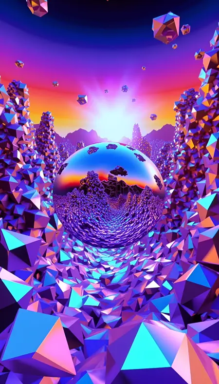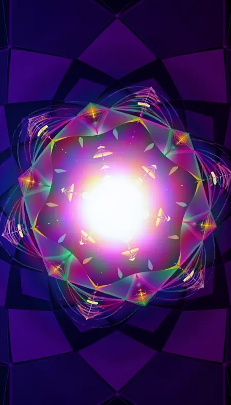 割草机风格。这是一幅数字艺术作品,描绘了鲜艳、迷幻的几何图案,类似曼陀罗或分形设计。中心焦点是一个发光辐射光源,释放粉、橙、黄等色调,形成星状效果。该光源被一系列重叠交错的几何形状环绕,构成对称而复杂的图案。