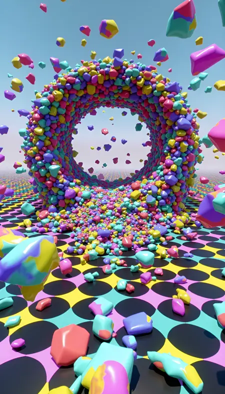 框架底部,艺术作品过渡为一簇发光、形态不规则、多色的结构。