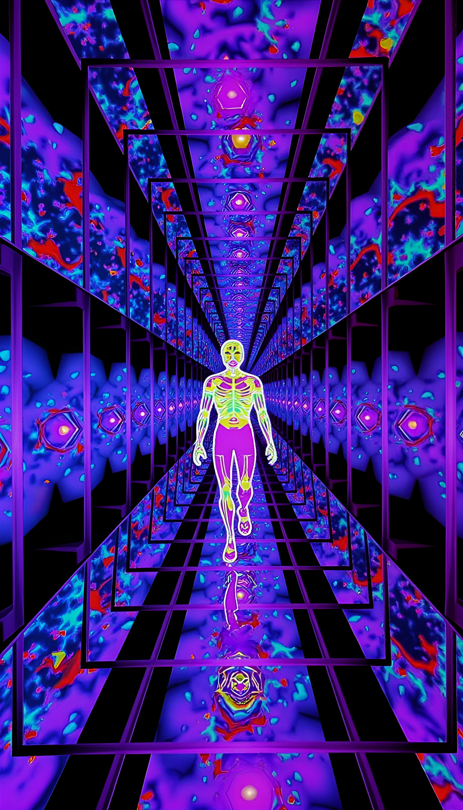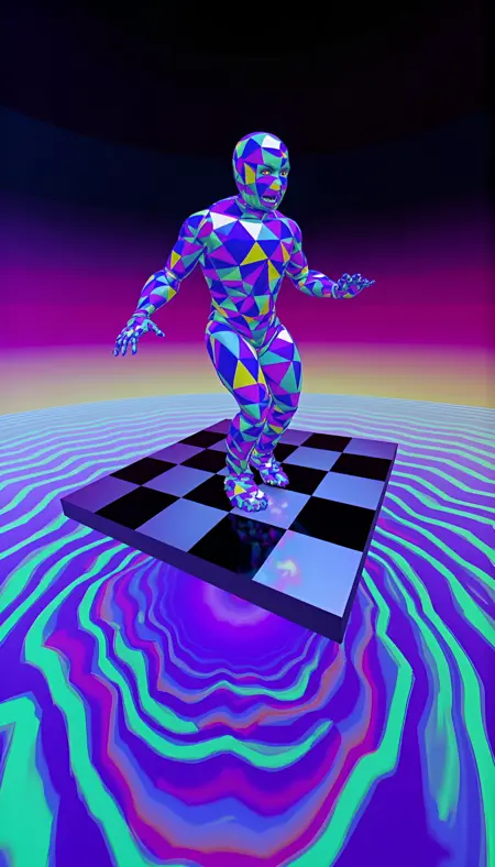 割草机风格。这幅图像是一幅CGI渲染的迷幻数字艺术作品,描绘了一位未来感十足的人形角色,置身于鲜艳抽象的环境中。角色呈动态姿势,仿佛漂浮或游动于漩涡状、色彩斑斓的宇宙景观中。其身体呈流线型、闪亮的金属紫色,表面光滑,近乎液体质感,暗示其具有未来或外星生物的特征。四肢修长纤细,头部为人形,面部平滑无特征。