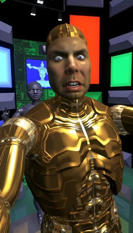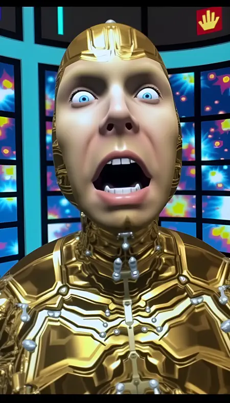 割草机风格。这是一幅CGI渲染的场景,具有超现实、未来主义美学。中心角色是一位金属镀金躯体、拥有人类面孔的类人机器人或仿生人。机器人面部表情空白,但嘴巴张开,仿佛在尖叫或呼喊。面部细节刻画精细,布满发光的蓝色线条,似电路或能量通路。双眼大睁,呈现出鲜明、近乎非自然的蓝色,增强了诡异氛围。