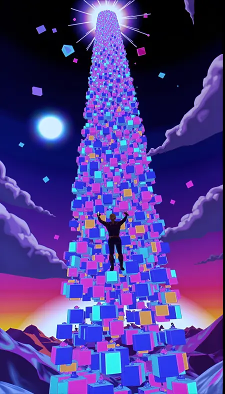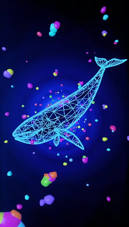 割草机风格。这是一幅数字艺术作品,描绘鲜艳抽象场景。画面展示一个彩色发光的抽象雕塑或装置,背景为深蓝色。作品由一个大矩形框架构成,主色为深蓝,边缘渐变为黑色,形成强烈对比。