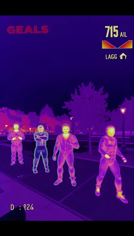 割草机风格。这幅图像是来自一款1980年代或1990年代初电子游戏或模拟器的截图,展示热成像显示界面。背景为深沉柔和的紫色,符合热成像技术的典型特征。画面左下角区域显示四个人物,以热辐射轮廓呈现。四人呈直线排列,中央人物略微领先于其他人。