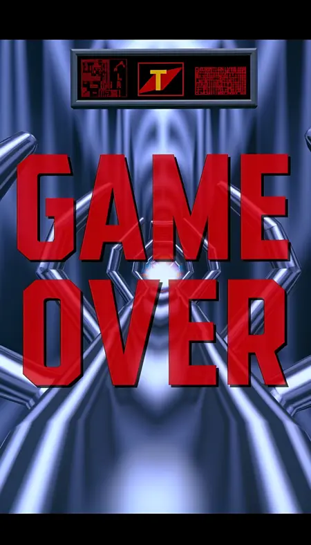 割草机风格。这是一幅来自3D计算机生成游戏或电影场景的截图,展现未来主义金属环境。画面中央醒目地印着粗体红色无衬线字体的“GAME OVER”字样,文字略带扭曲,产生三维效果。