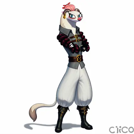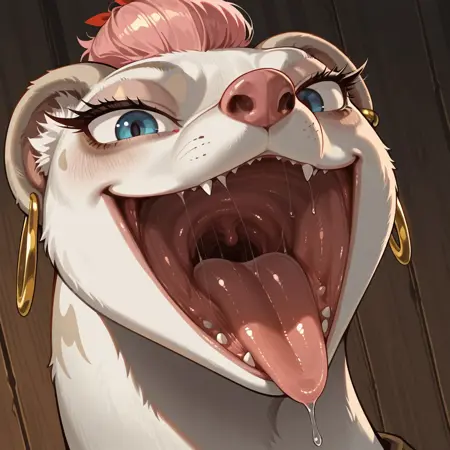 Weasel, white fur, pink hair, pink nose, blue eyes, eyelashes, bags under eyes, long tail, gold earrings,