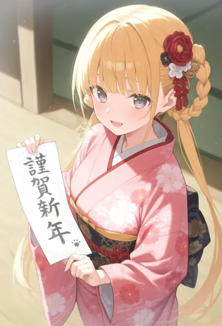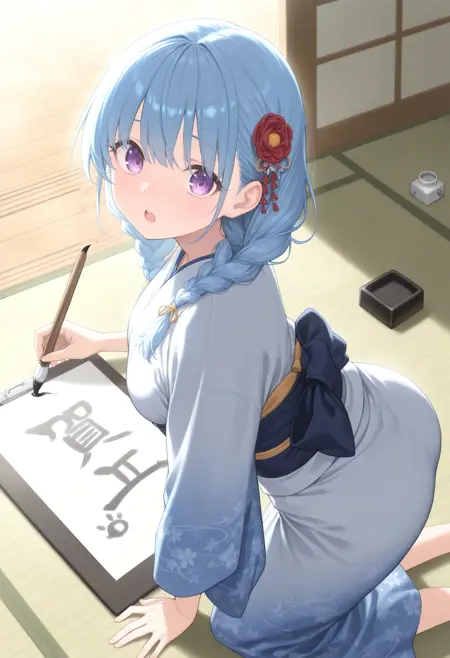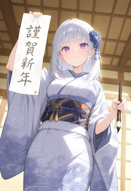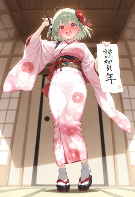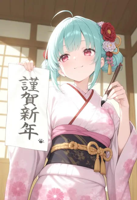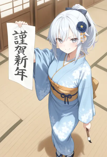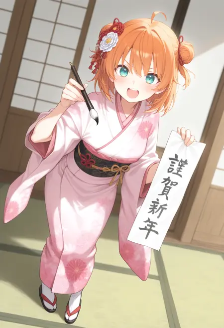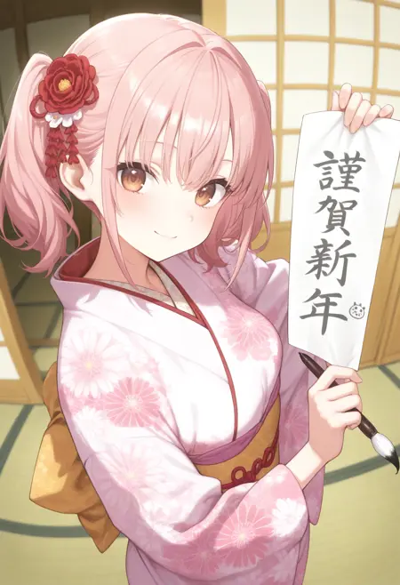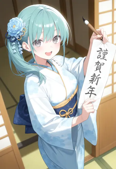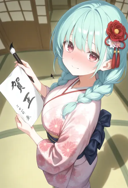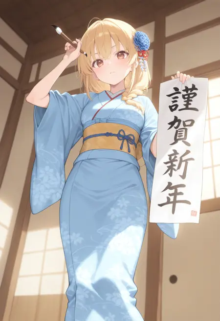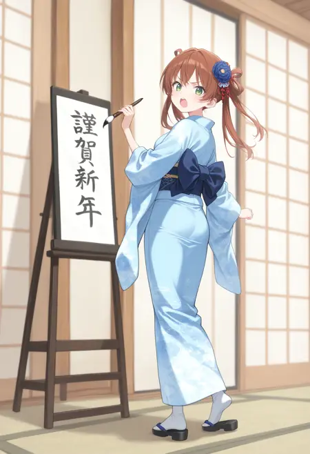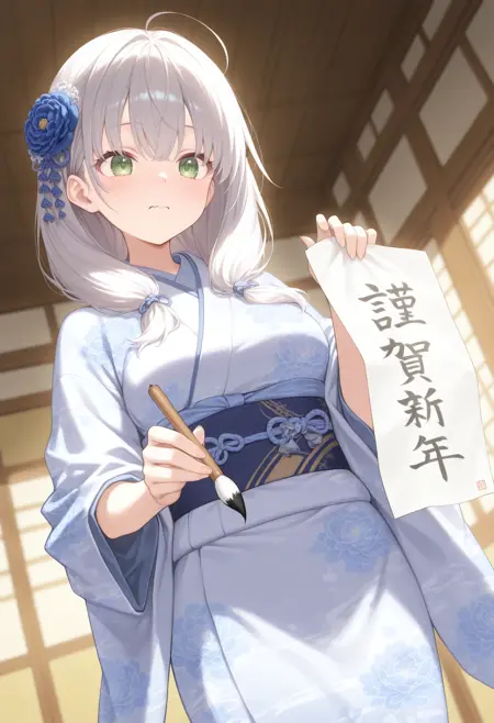 “new year”, “holding”, “calligraphy”, “happy new year”, “calligraphy brush”, “holding paper”, “standing”, “hand up”, “arm up” 등의 단어를 포함하면, 쓴 종이를 보여주는 듯한 구도가 됩니다. 인크웰, 올 포스, 인크 병, 잉크, 팔 받침, 서예 붓, 서예, 단축법, 무릎 꿇음, 실내, 붓 잡기, 바닥에 앉기, 그리기, 그림, 앞으로 기울기, 신년 등의 단어를 적절히 추가하면 서예하는 장면을 자연스럽게 표현할 수 있지만, 생성되는 문자는 본질적으로 정상적인 글자가 아닙니다. 좋은 그림이 나왔다면 문자 부분만 수동으로 수정하는 것을 권장합니다.