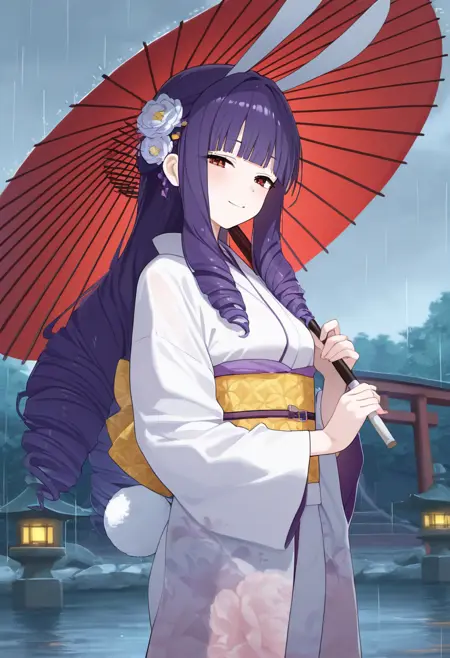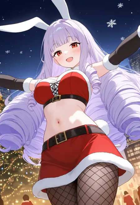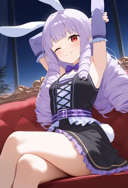 빨간 눈, 긴 머리카락, 보라색 머리카락, 드릴 헤어, 둔한 앞머리, 흰색 동물 귀, 토끼 꼬리,