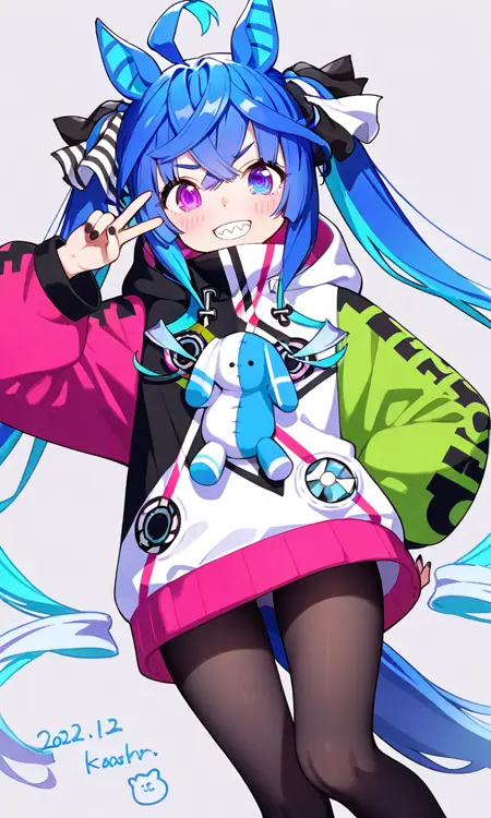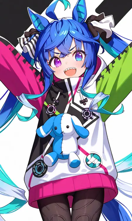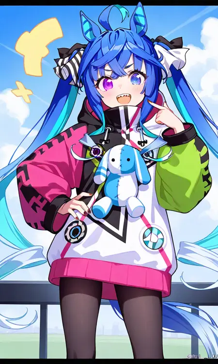 亮蓝色头发,天线发,梳成两束戏剧性的双马尾,用两条黑白条纹缎带固定,双马尾呈卷曲波浪向外散开,凌乱的刘海,发梢呈卷曲状,异色瞳,一只紫色眼睛,一只蓝色眼睛,双眼均有催眠漩涡图案,马耳,与发色匹配的青绿色耳饰,带有条纹,内侧为未来主义设计,尖锐的牙齿。