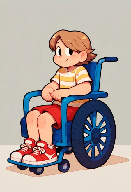 LucaTDM, 1boy, light medium brown hair, yellow and white striped shirt, red shorts, red sneakers, black eyes, short,