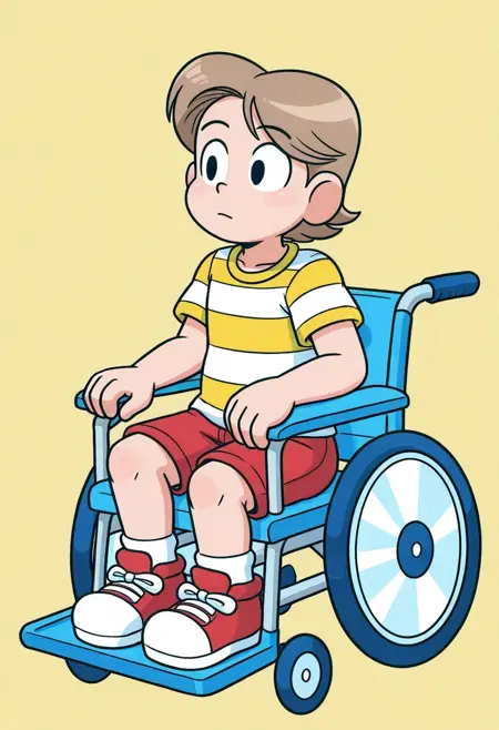 LucaTDM, 1boy, light medium brown hair, yellow and white striped shirt, red shorts, red sneakers, black eyes, short,