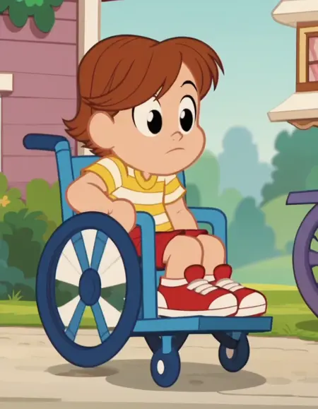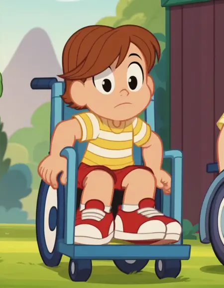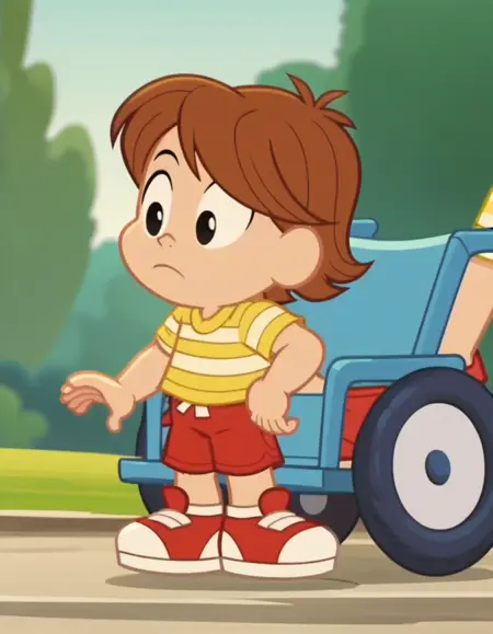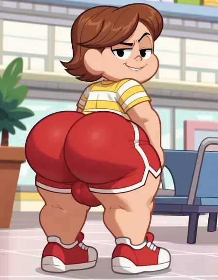 LucAATDM, brown hair, shirt, 1boy, shoes, shorts, striped, black eyes, sneakers, striped shirt, red shorts,