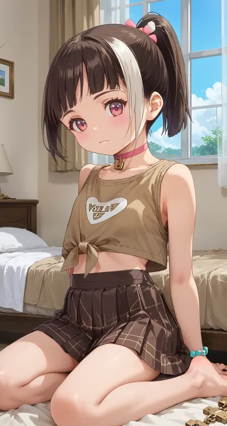 角色:千秋,棕色头发,马尾,刘海,白色发束,发饰,粉色眼睛,项圈,
