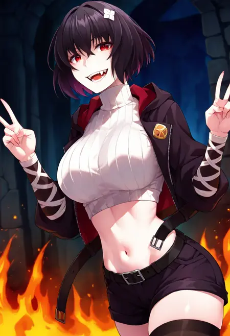 Outfit: "midriff, turtleneck sweater, shorts, thighhighs, navel, black shorts, black belt jacket"