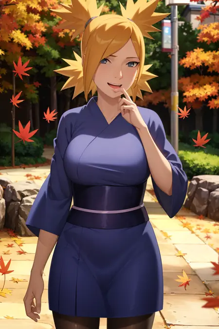 masterpiece, absurdres , (intricate details), (colorful),cinematic lighting,bust shot,extremely detailed CG unity 8k wallpaper,temari\(boruto\), 1girl, solo, mature female, blue kimono, hands on hips, pantyhose,outdoors, dessert, rock, cloud, sunlight, blue sky, looking at viewer, smile,