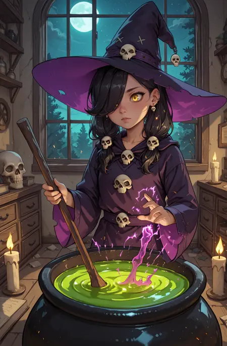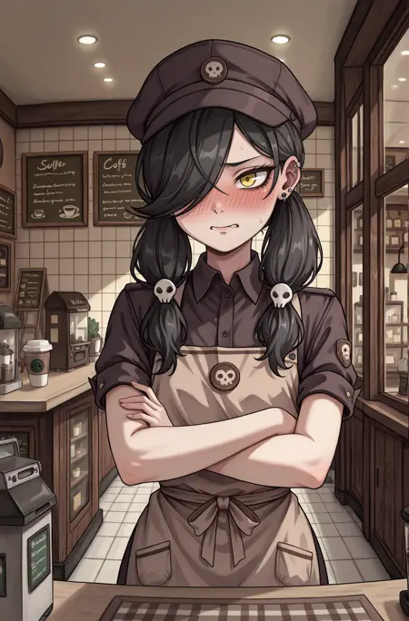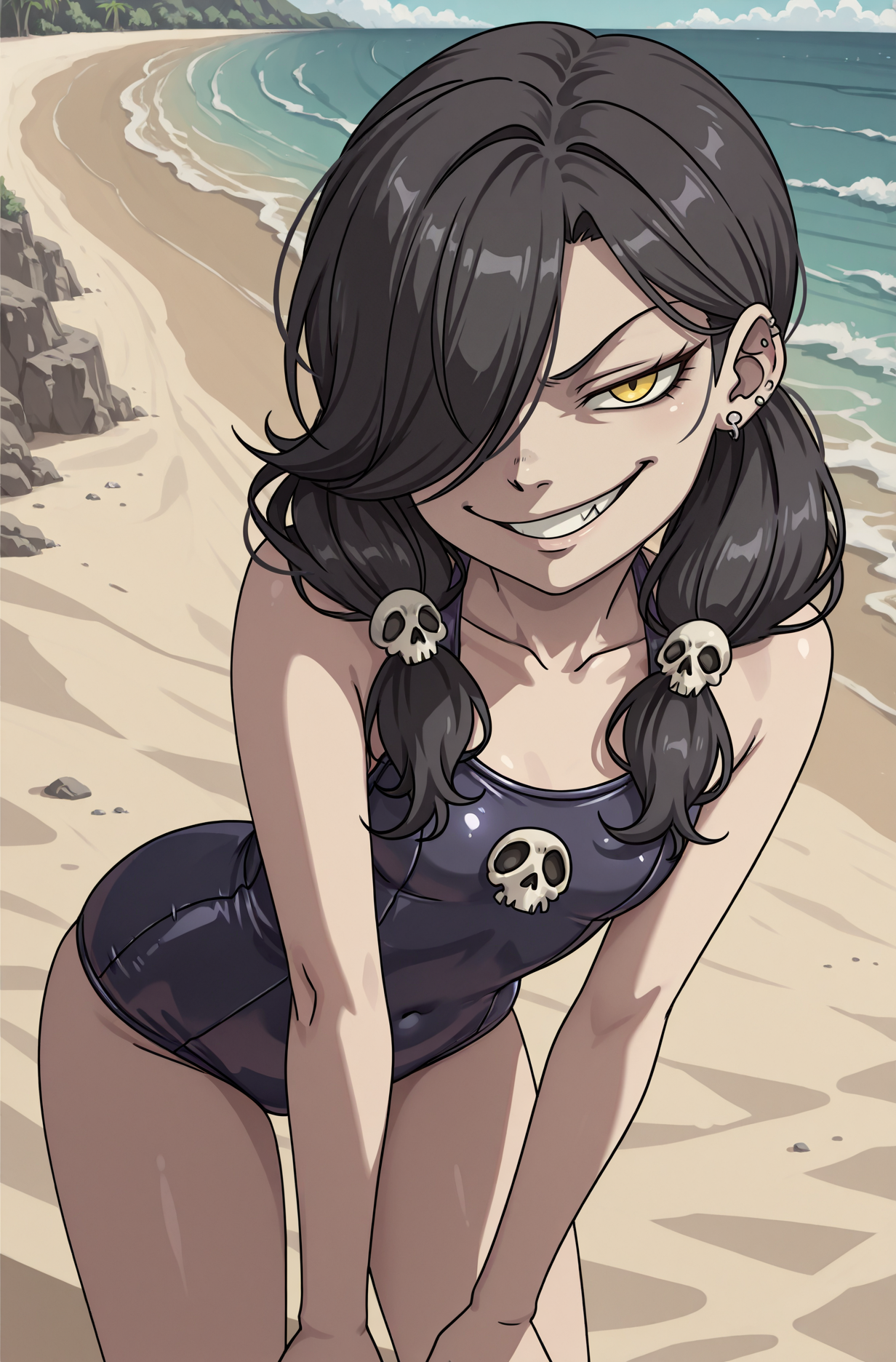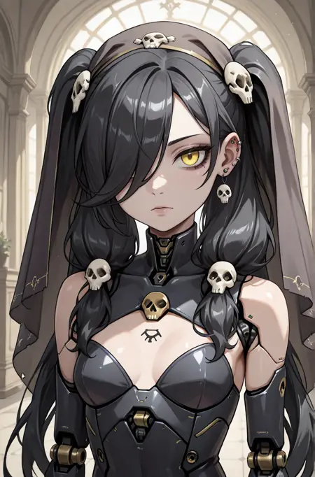 1girl, s4m_sp4rt4n, solo, hair over one eye, black hair, hair ornament, yellow eyes, long hair, twintails, earrings, piercing,