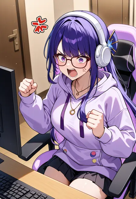 rdenShgunAnv,紫色头发,鬓发,紫色眼睛,眼镜,戴眼镜,耳机,发饰,紫色连帽衫,帽子下垂,抽绳,长袖,项链,珠宝,包,百褶裙,黑色裙子,现代,休闲