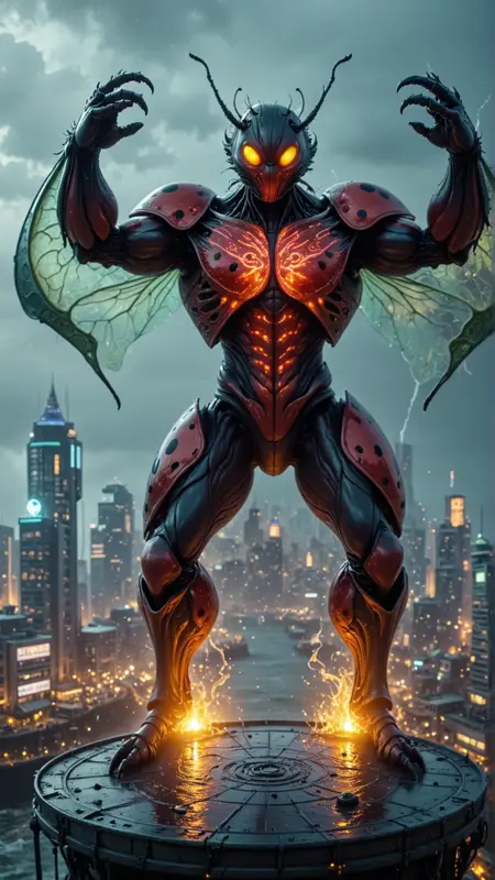lora:InsectHybridSDXL:1monster, hybrid, insecthybrid ladybug, the hybrid is a woman, in location city park pathway with trees, full body, humanoid