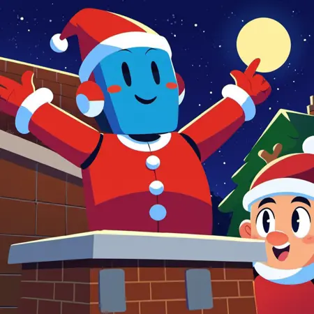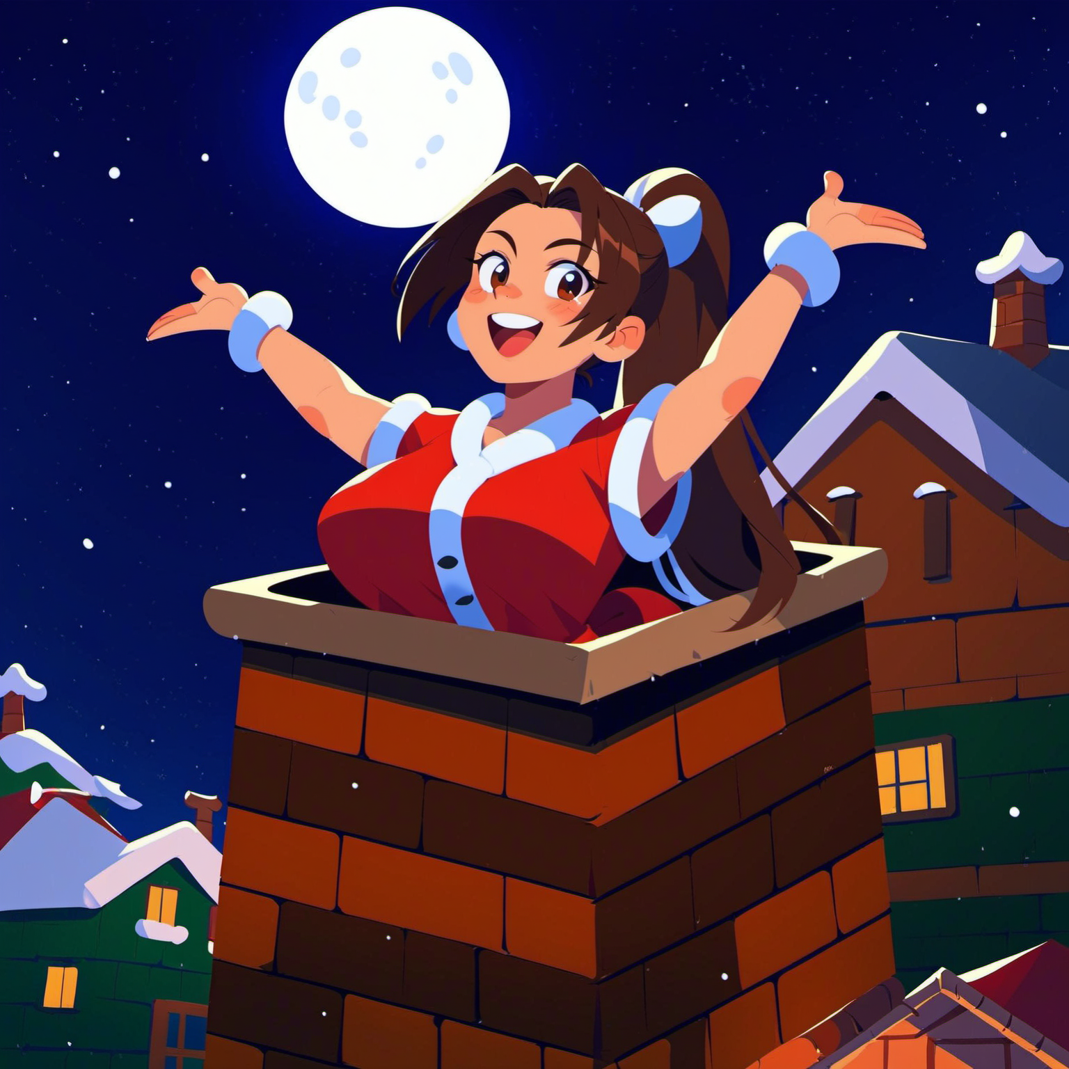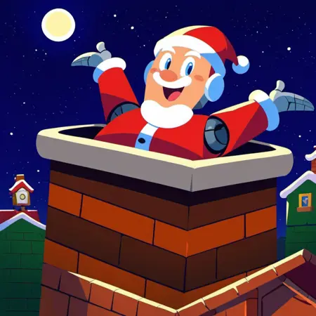 长格式提示词:圣诞老人、圣诞服、胖、双臂上举、快乐、张嘴、烟囱、圣诞老人在烟囱里、夜晚、月亮、圣诞帽、白色胡须、白色眉毛、白色胡须、房屋、雪、脸红、蓝眼睛、卡通、砖块、耳朵