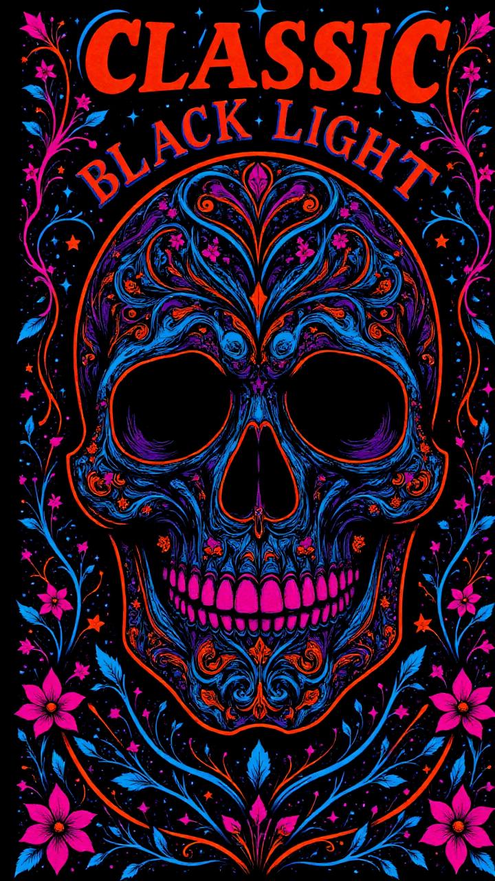 经典黑光海报是终极复古氛围——在紫外光下如魔法般发光的醒目、迷幻设计,仿佛将70年代的霓虹梦境直接带到你的墙上!