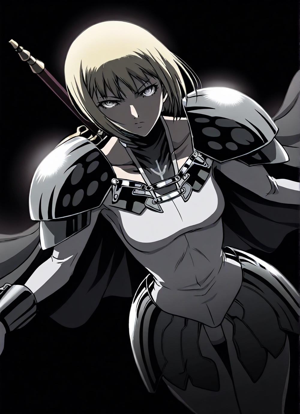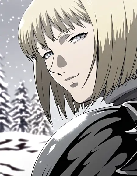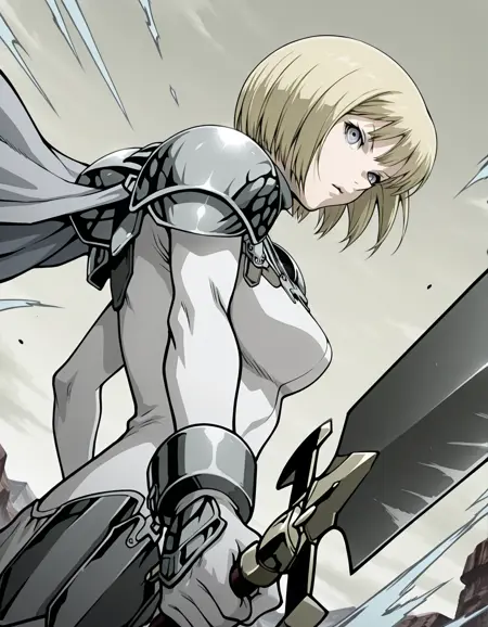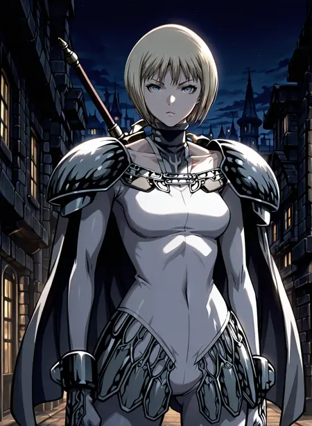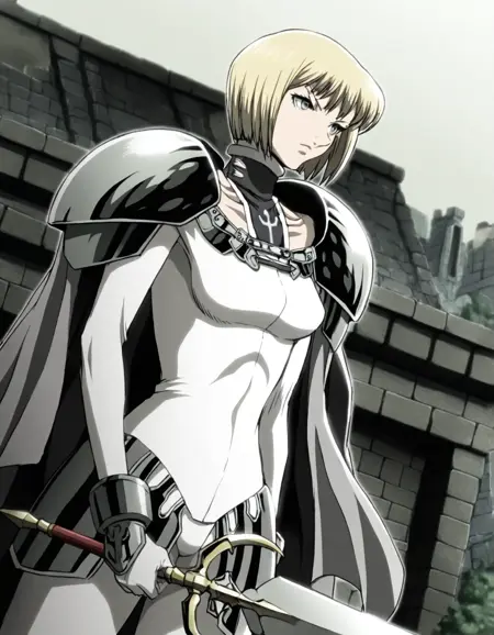 クレア、ショートヘア、金髪、まっすぐな前髪、灰色の目、白いボディスーツ、パルドロン、紋章、カーペ、白い手袋、手首のカフス、下部の装備、装甲付きの靴
