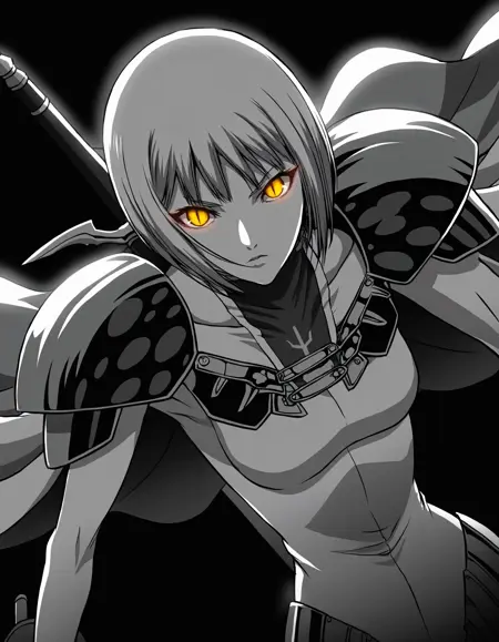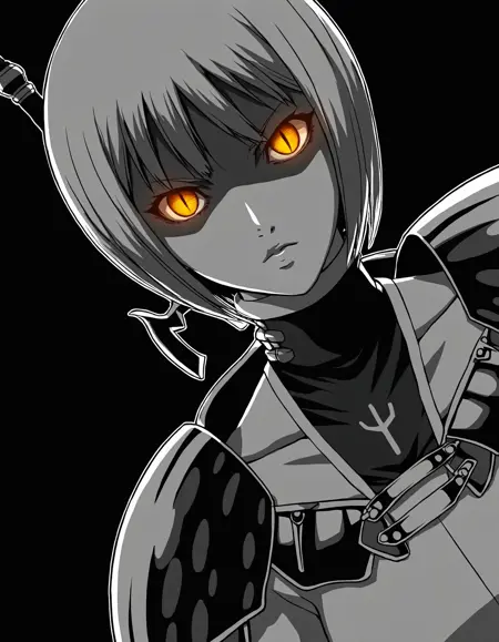 追加: 黄色い目、縦に細長い瞳孔、発光する目、背中に剣、鎖骨