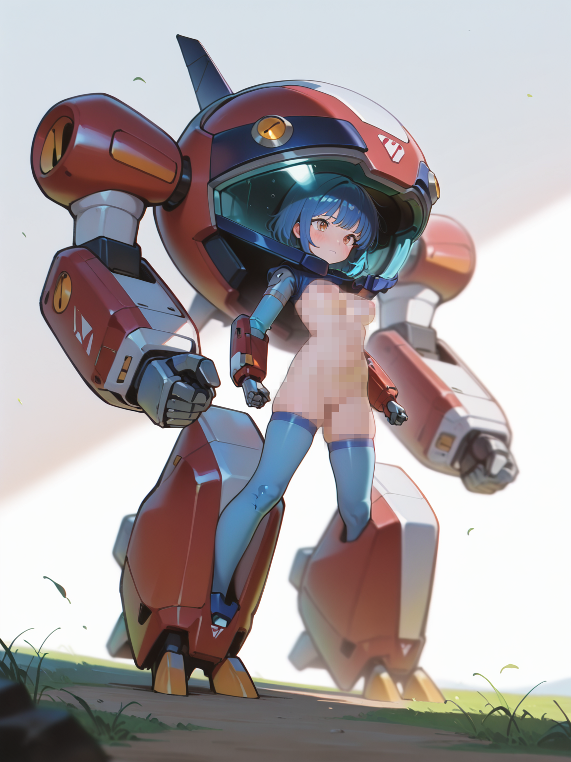 oman, blue elbow gloves, blue thighhighs, mecha suit, red mecha arm armor, visor down/up,