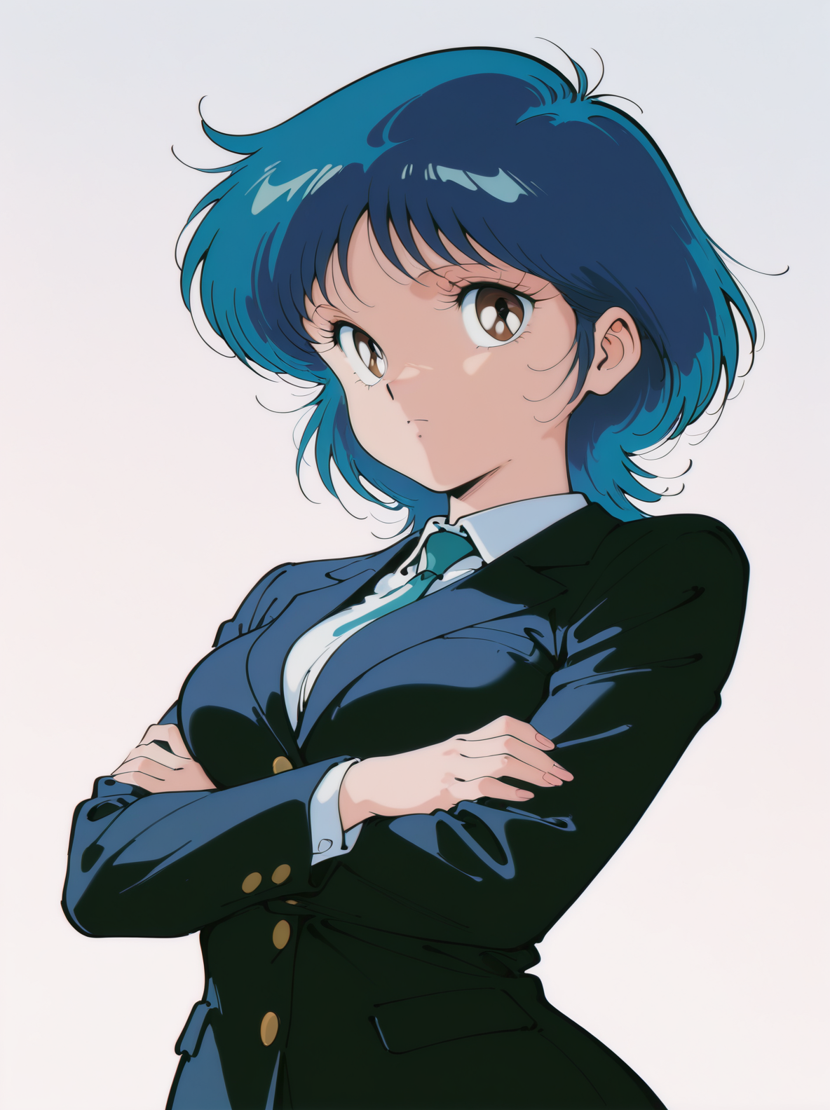 Base prompt: (may need short hair, brown eyes, blue hair, 1980s \(style\))