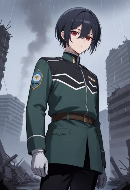 若い姿: DH_05、軍用ジャケット、グリーンのジャケット、長袖、白い手袋、黒いズボン、コンバットブーツ