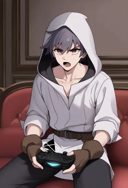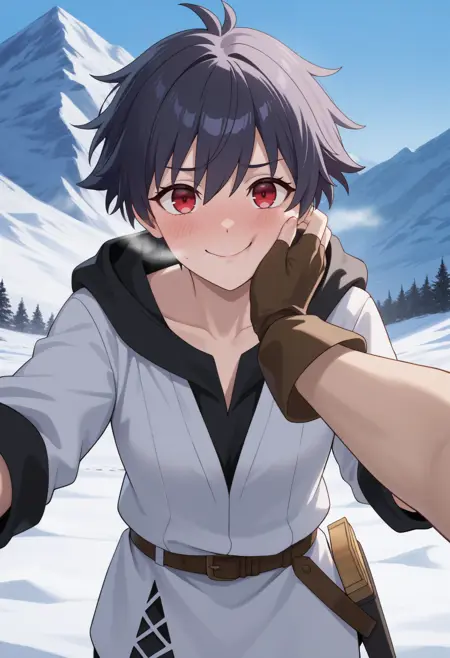 デフォルト: godleoheart、白いフーディー、フードを下ろした状態、袖をまくった、鎖骨、茶色の手袋、指なし手袋、茶色のベルト、黒いズボン、黒いブーツ