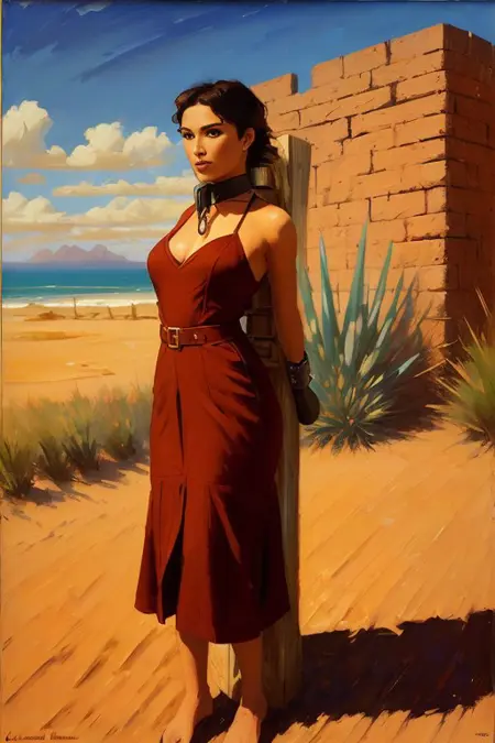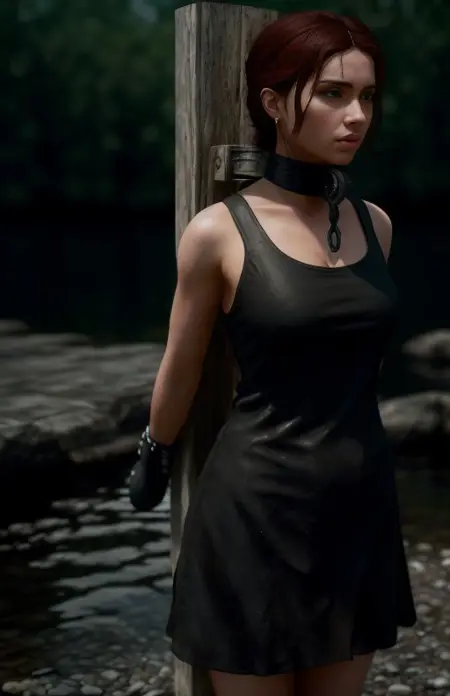 standing by wooden pole,metal fitting,nude female body made in blender, Eve Ryder,3D render skin, skyrim screenshot