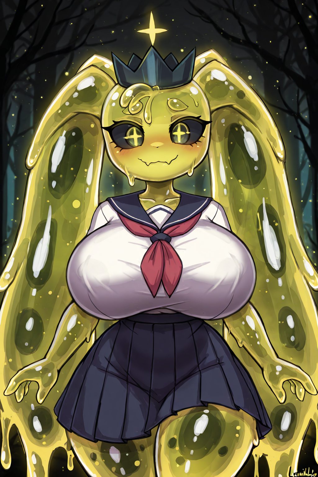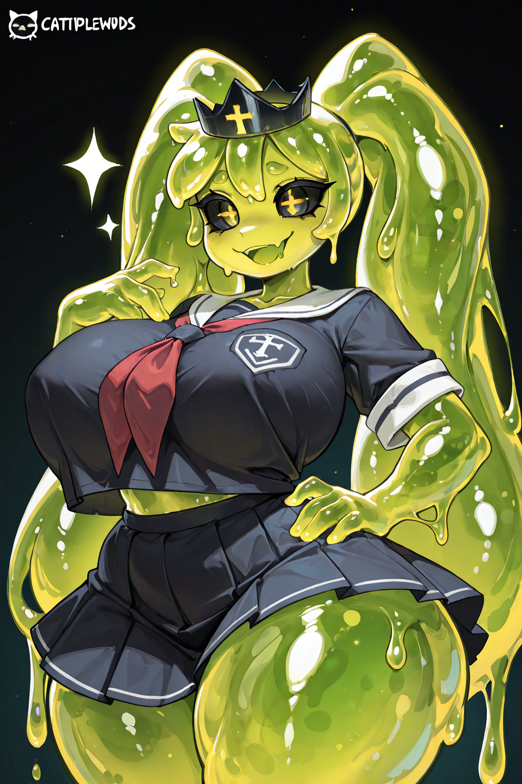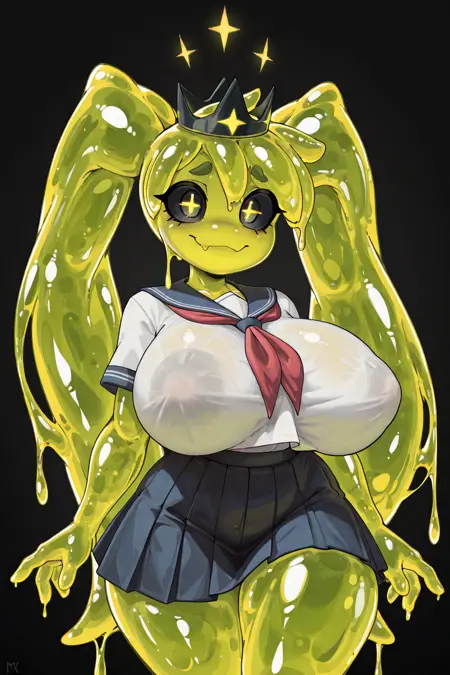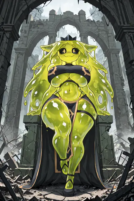 트리거: SlimeAtlyss, 여성, 점액 생물, 거대한 가슴, 왕관, 검은 공막, 십자 pupils, 인조, 녹색 몸체, 곡선형 몸매, 풍만한, 허리띠, 반투명한 몸체, 두꺼운 허벅지, 넓은 골반, 할터넥
