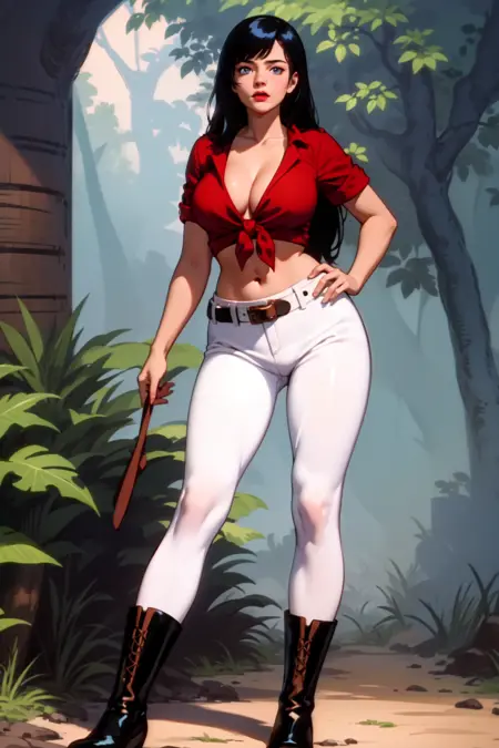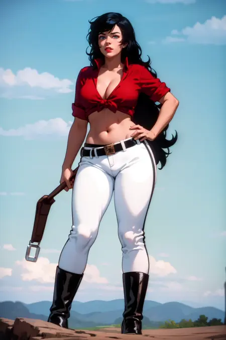 Clothes: tied shirt, pants, boots, belt, midriff