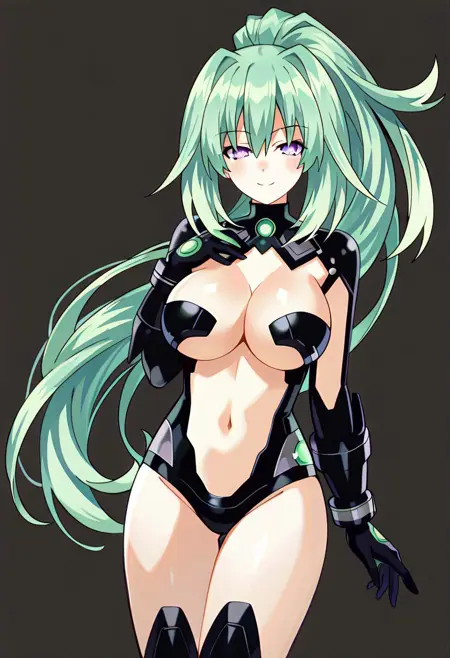 hyperdimension neptunia, 1girl, ソロ, ハート, 胸, 緑の髪, 長い髪, ソロ, 大きな胸, アッパーボブ, パワーシンボル, ポニーテール, 紫の目, シンボル形状の瞳孔, 手袋, 視線前方, 武器, へそ, バストライン, 非常に長い髪, 肘まで続く手袋, 笑顔, 肩出し, 白い手袋