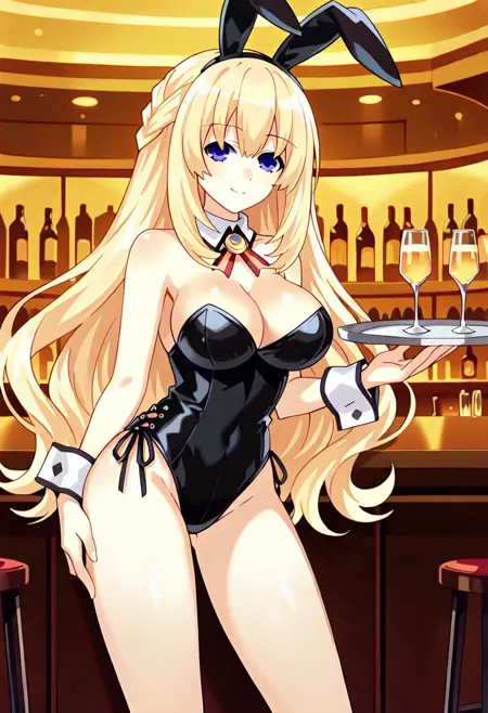 hyperdimension neptunia, vert, 긴 머리, 금발, 파란 눈, 1소녀, 혼자, 큰 가슴, 미소, 어깨 드러남, 장갑, 젖꼭지 노출, 시청자 바라보기, 매우 긴 머리, 흰 장갑, 드레스