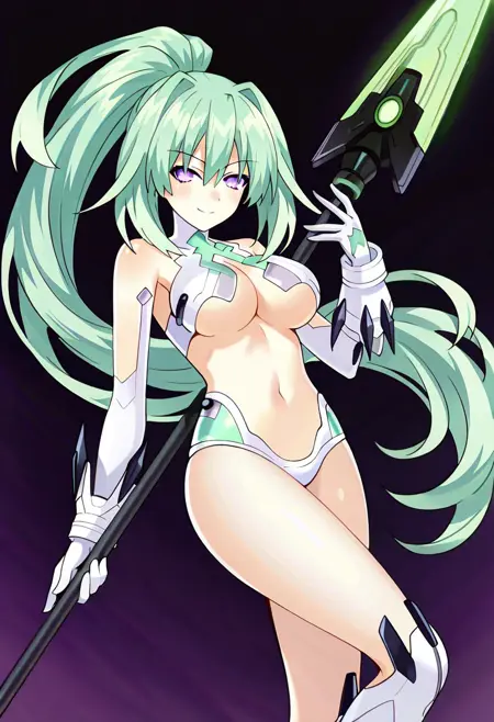 hyperdimension neptunia, 1소녀, 혼자, 하트, 가슴, 초록색 머리, 긴 머리, 혼자, 큰 가슴, 아랫가슴 노출, 파워 심볼, 폰테일, 보라색 눈, 심볼 모양의 동공, 장갑, 시청자 바라보기, 무기, 배꼽, 젖꼭지 노출, 매우 긴 머리, 팔꿈치 장갑, 미소, 어깨 드러남, 흰 장갑